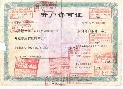 開戶許可證-滄州亞龍壓濾機(jī)有限公司