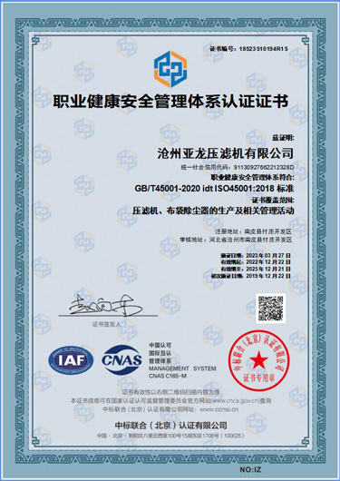 職業(yè)健康安全管理體系認(rèn)證證書(shū)-滄州亞龍壓濾機(jī)有限公司